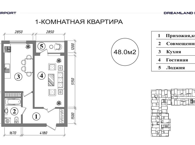 Квартира 1 комната 48 м² Ташкент, Узбекистан