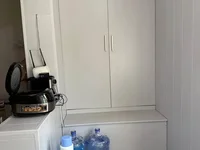 шкафлар, музлатгич, кондиционер, кир ювиш машинаси, тўлиқ жиҳозланган ошхона, юмшоқ мебель ва икки пуфик.